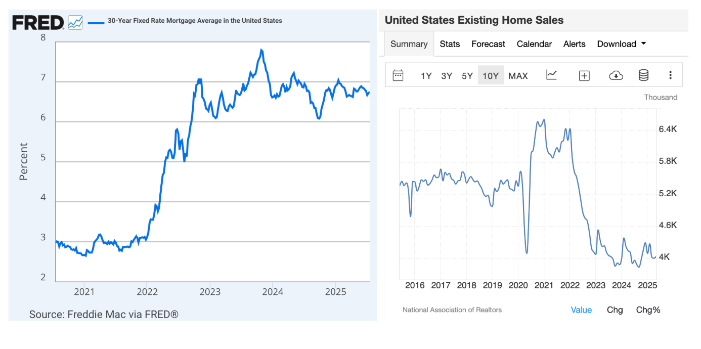 By far the biggest headwind Opendoor currently faces, as a "market-maker" of sorts, is still a historically low amount of existing home sales turnover (ie. a "housing recession"). We're still recovering from a ZIRP-era hangover where existing home owners are locked into sub-4% rates (constraining supply) and first-time buyers can't participate due to generationally high unaffordability dynamics (constraining demand).